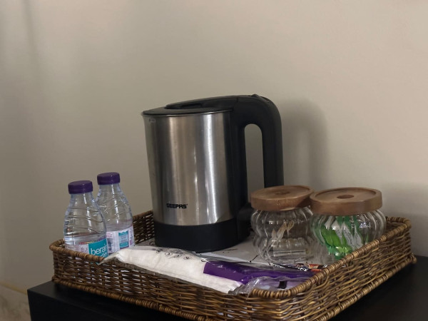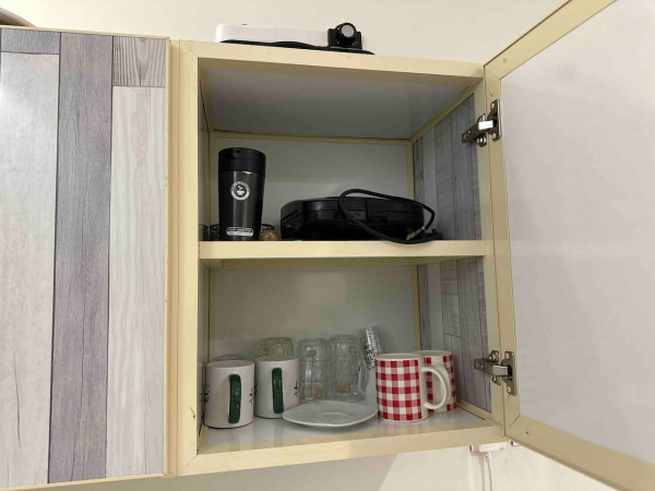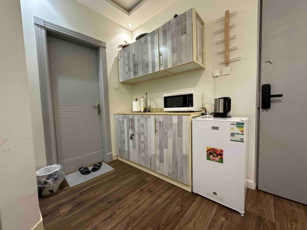 •Kitchen: The compact kitchen is equipped with a refrigerator, microwave, kettle, sink,