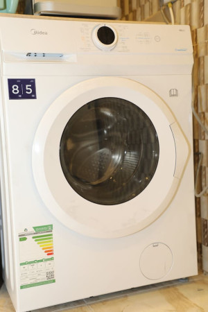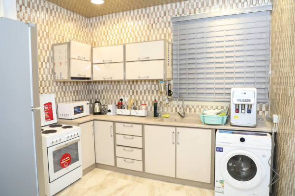oven, stove, washing machine, kettle, toaster, and basic kitchen utensils (plates, cups,