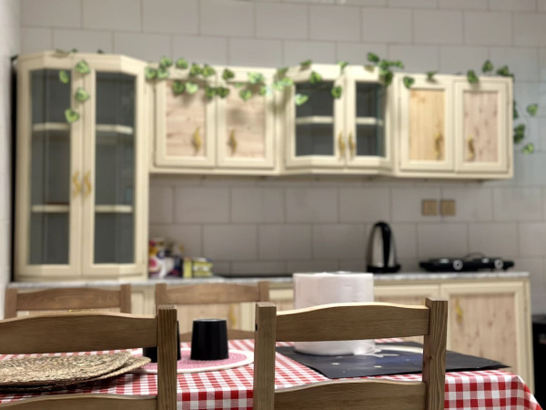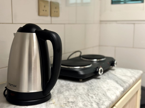• Kitchen: Fully equipped with a refrigerator, microwave, stove, kettle, dining table, and all